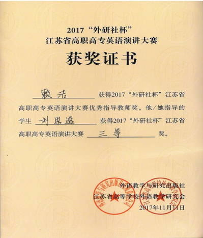 2017“外研社杯”江苏省高职高专英语演讲大赛于 11 月 9 日-11 日在江苏城市职业学院举行,全省共有 67 所高职高专院校,共计 194 名选手参加比赛。我校设计学院装饰15-3丁铮和经济管理学院财会16-2班刘思逸两位同学均在非专业组的比赛中获得三等奖。